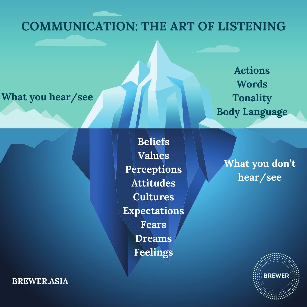Think of communication like an iceberg. The words we hear are just the tip—only a small fraction of the message. The real meaning lies beneath the surface: emotions, values, beliefs, unspoken concerns, and motivations.