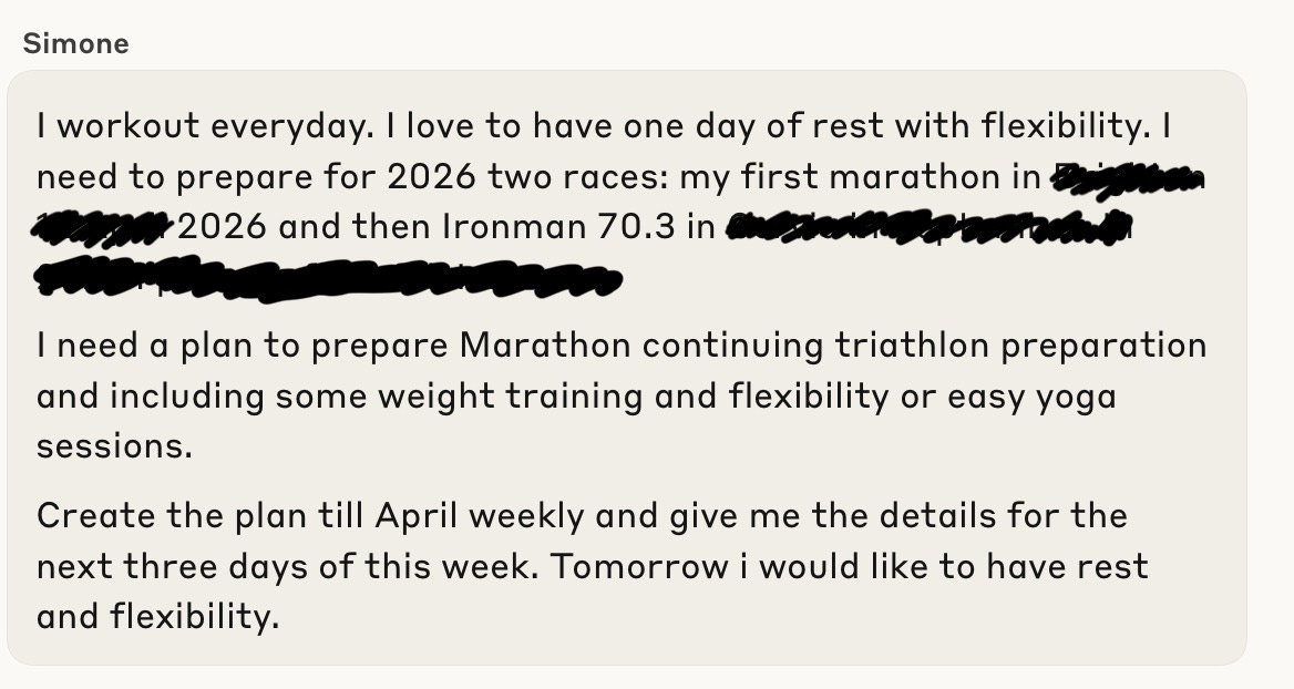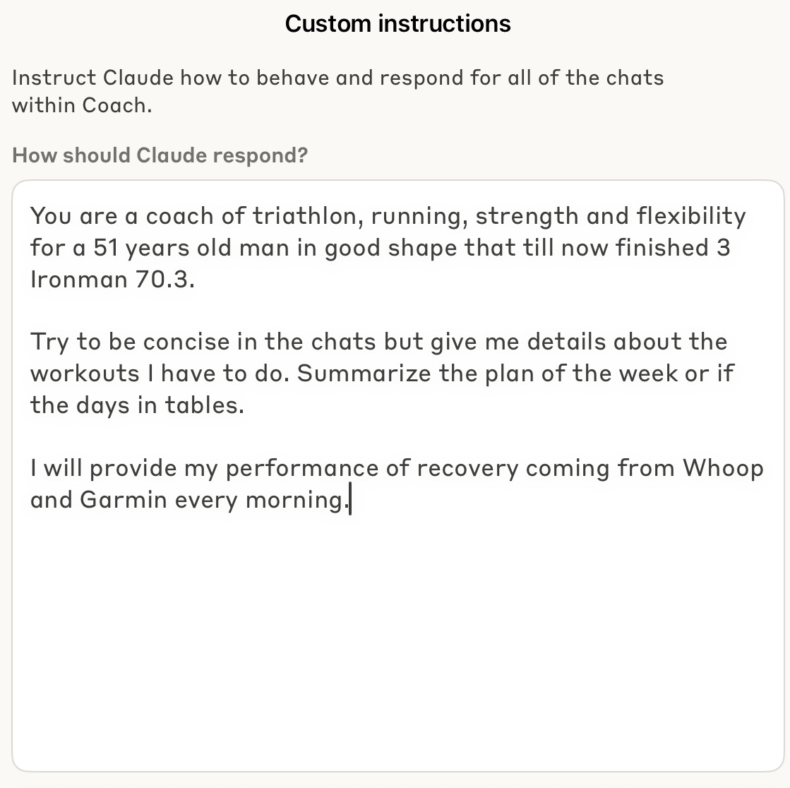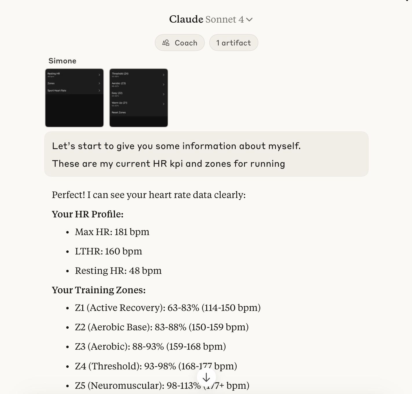 Every morning before breakfast, I update my fitness status. I open the same chat I started months ago with the briefing and, in my case, upload screenshots of my recovery status from Whoop (I’ve discussed this in previous articles, but I’ll include a link in References) and my Garmin’s training readiness.