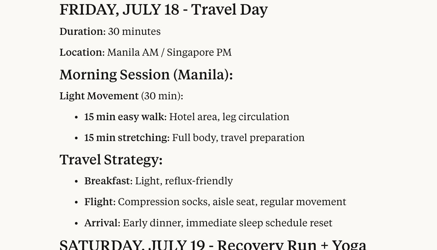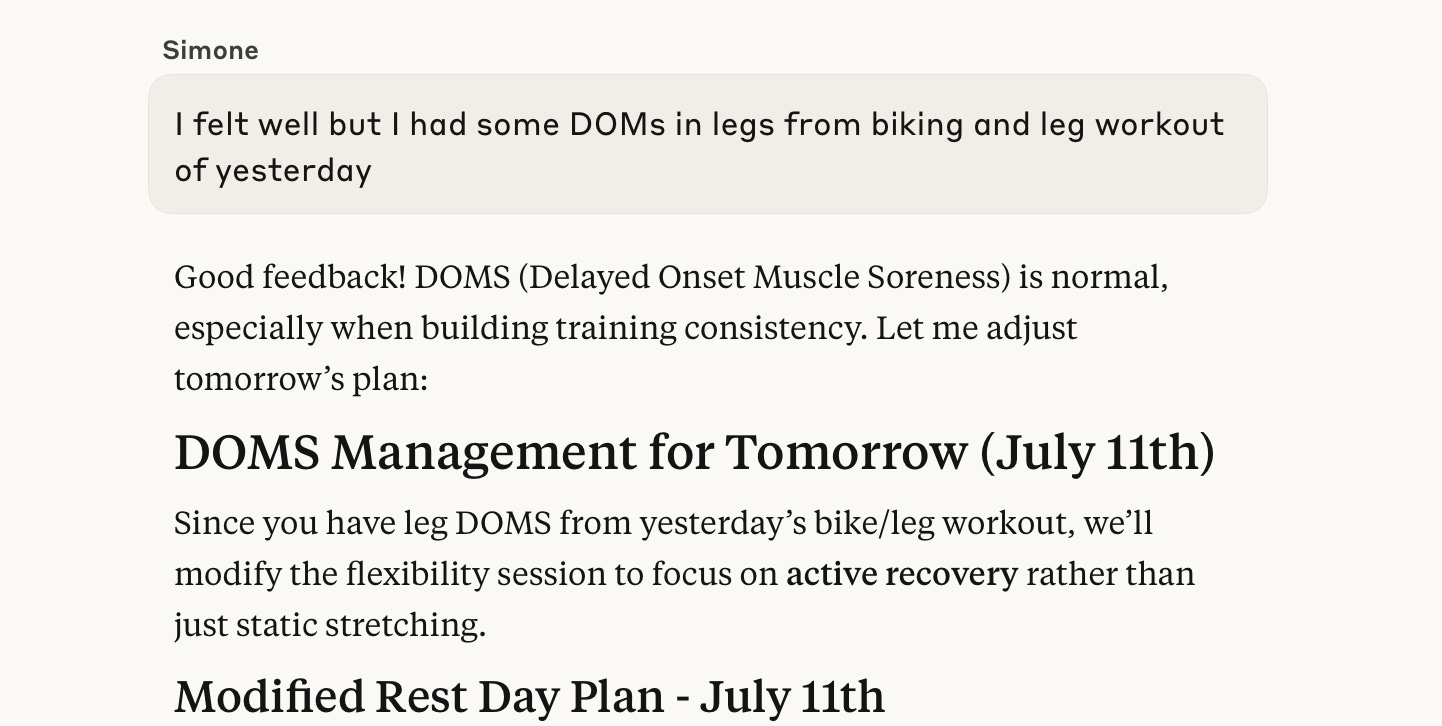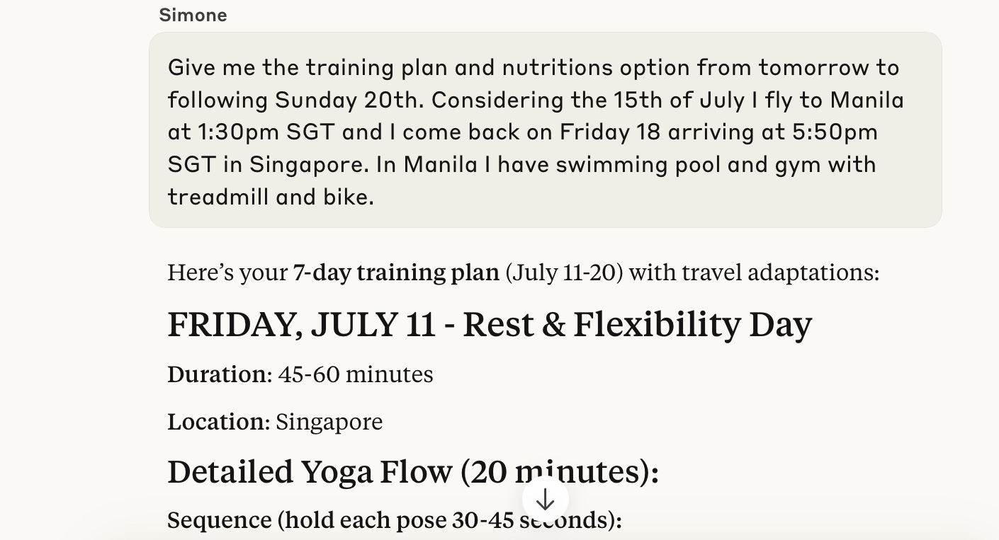 As you saw, I immediately requested a detailed daily plan for the next three days. It delivers instantly, and trust me, after years of training with coaches, it’s brilliantly designed. If something doesn’t seem right, tell it, and it adjusts immediately.
