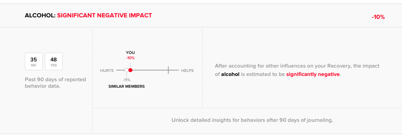 According to my Whoop insights, alcohol is by far the worst factor I’ve monitored in relation to sleep quality. My experience aligns with findings from millions of other Whoop users.