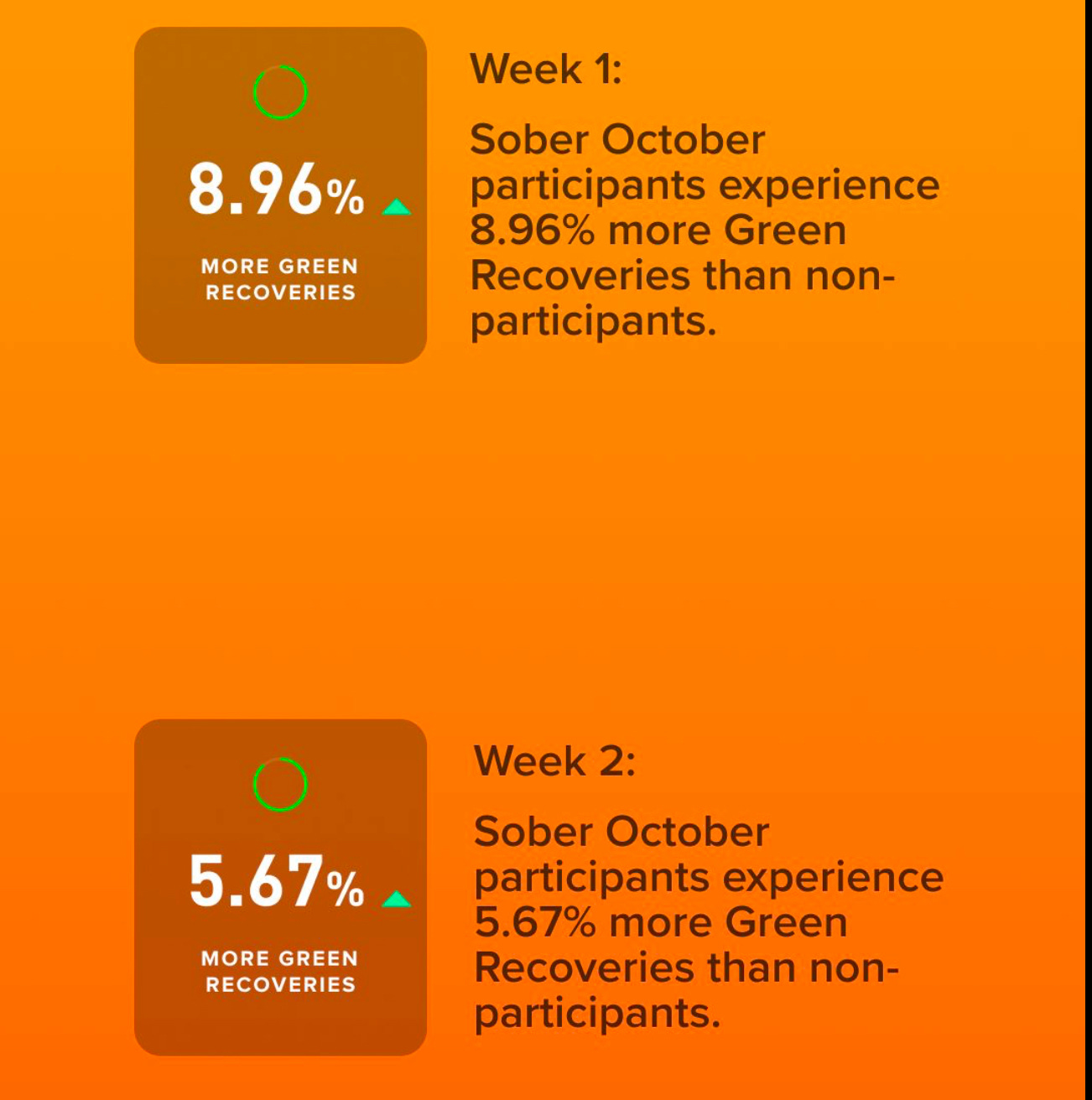 I’m not alone in this. In October 2024, Whoop conducted an experiment asking its users to stop drinking alcohol for the entire month and analyzed the results of those who participated versus those who didn’t. The recovery scores of those who abstained improved significantly.