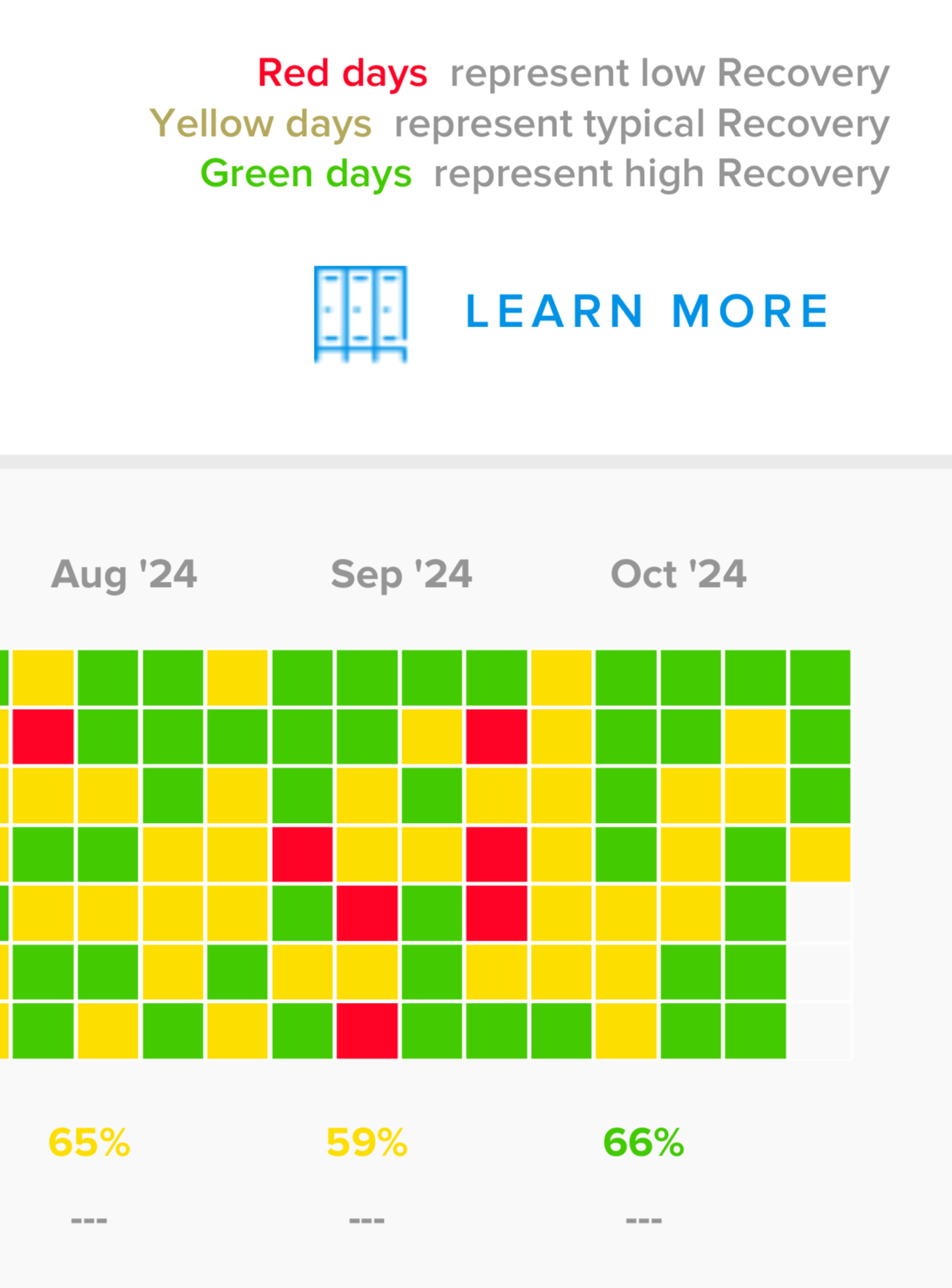 The rest of my activities, including the number of flights and hours of sleep, were similar. Yet, in October, my recovery significantly improved: zero “red” days and many more “green” days.