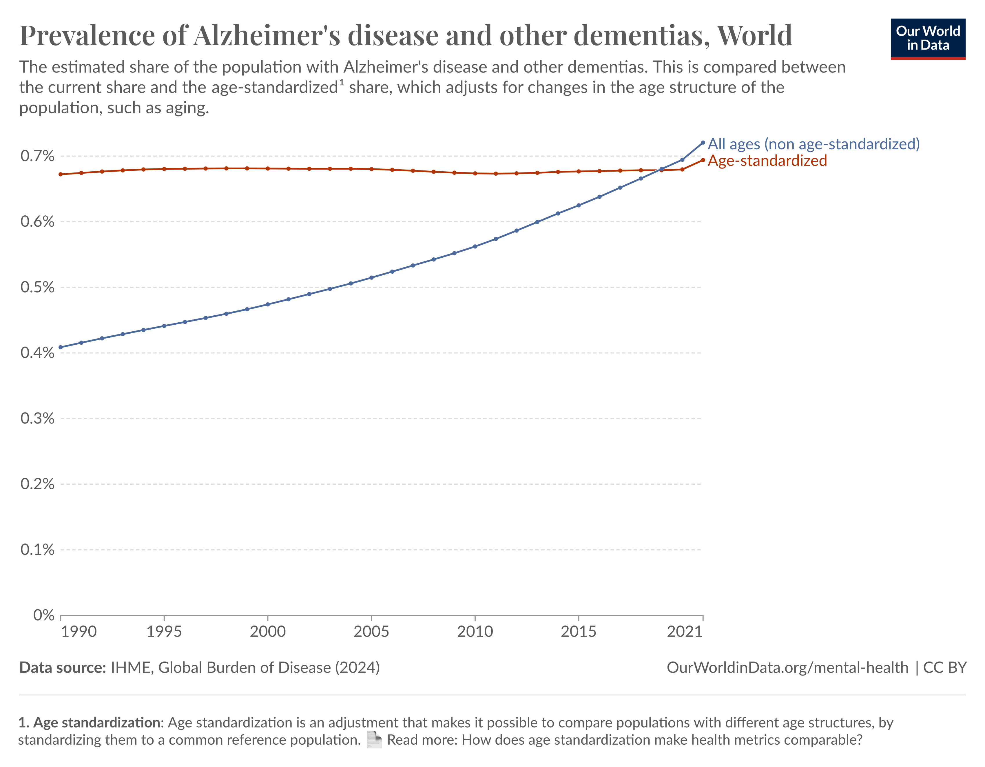 This upward trend is primarily attributed to aging populations, particularly in low- and middle-income countries where 60% of people with dementia currently reside—a figure expected to rise to 71% by 2050. In fact, if the effect of population aging is offset (age-standardized), the growth curve flattens.