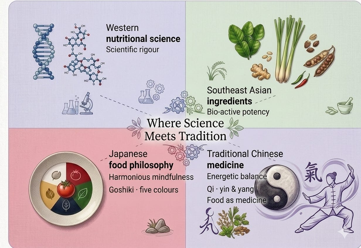 Having lived and worked across Singapore, Malaysia and Japan, I’ve had the privilege of drawing from several cultures and traditions at once: Western nutritional science, Southeast Asian ingredients, Japanese food philosophy and traditional Chinese wellness principles More often than not, they arrive at the same truths from different directions.